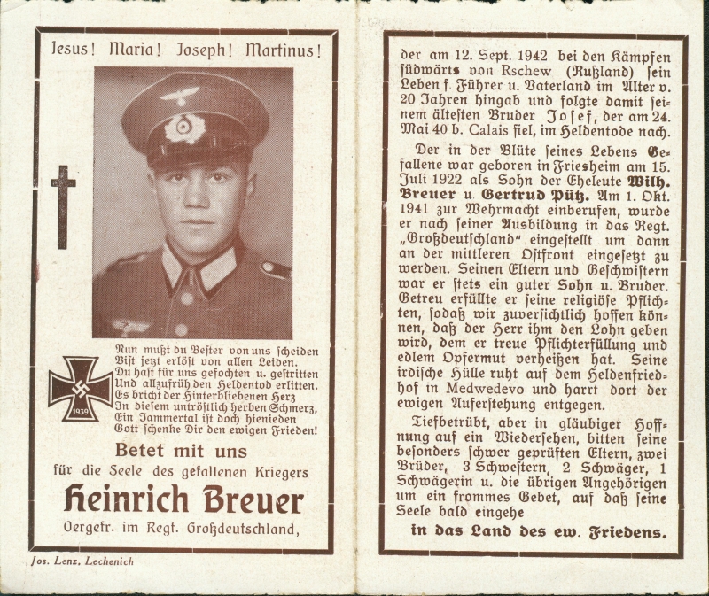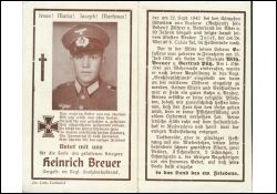 Obergefreiter; Eltern: Wilhelm Breuer und Gertrud Pütz; Gefallener 2. Weltkrieg |