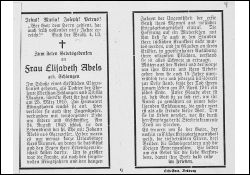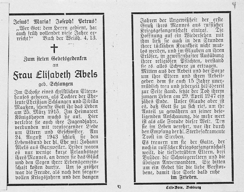 Eltern: Christian Schlangen u. Sibilla Maaßen; ∞ 24.8.1943 Johann Abels aus Garzweiler; Hochzeit während des Heimaturlaubes ihres Mannes von der Front, dieser immer noch in russischer Gefangenschaft |