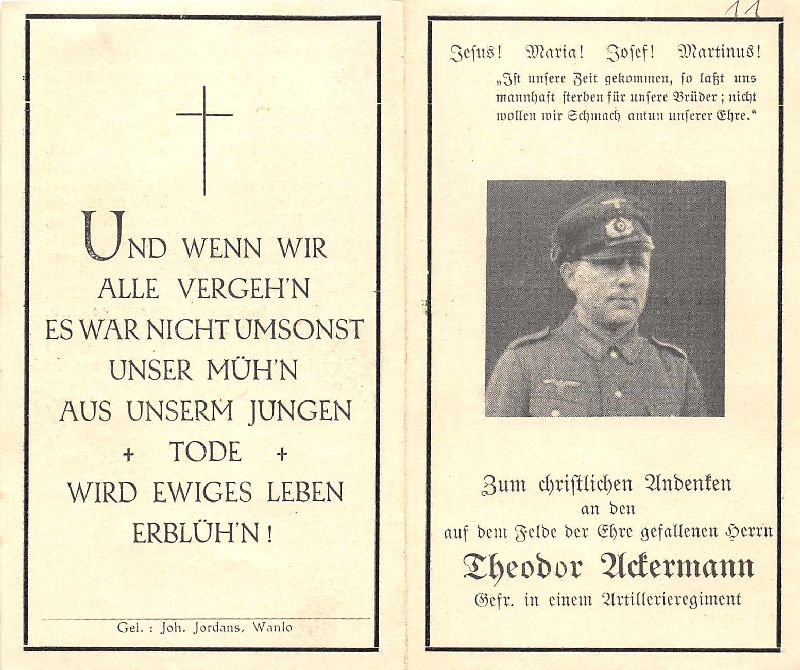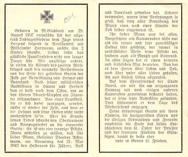 Gefallener 2. Weltkrieg; ∞ in Borschemich Wilhelmine Hurtmann; 2 K.; Abwehrkämpfe im Osten am Ilmensee; Ehrenfriedhof der Stadt Newel |