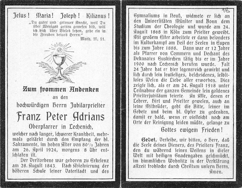 Priesterweihe Köln 24.8.1868; während des Kulturkampfes in Eupen bis 1888; dann 12 J. Pfarrer in Kommern u. Dechant des Dekanates Euskirchen; 1900 Oberpfarrer in Lechenich; 1918 Priesterjubiläum |