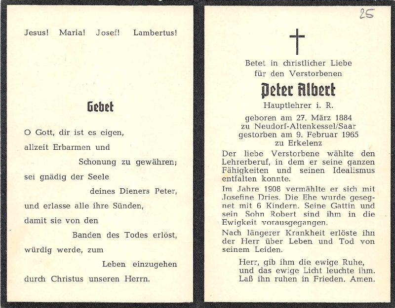 Hauptlehrer i. R.; ∞ 1908 Josefine Dries, † ; 6 K., davon Sohn Robert †,längere Krankheit |