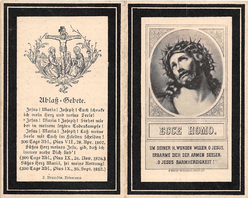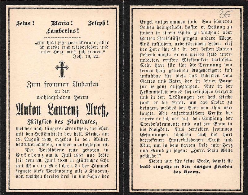 Mitgl. des Stadtrates in Erkelenz; ∞ 26.6.1886 Maria Melchers; 9 K., davon 3 †; schweres Leiden, suchte Heiliung in einem Spital in Aachen; |