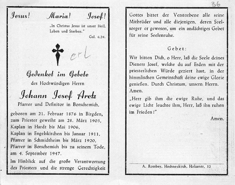 | Priesterweihe 28.3.1903; Kaplan in Hardt bis 1906, in Engelskirchen bis 1920; Pfarrer in Borschemich seit 1920 |