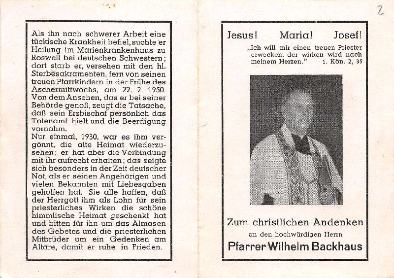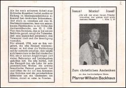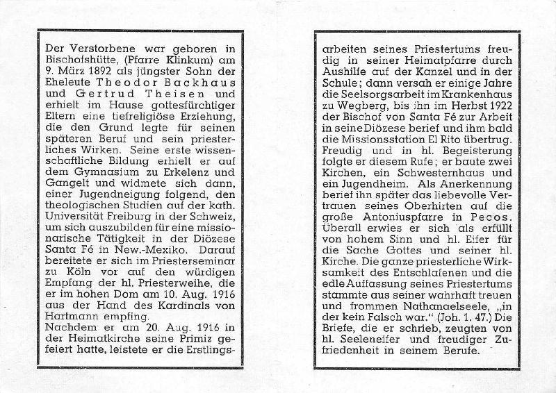 | Eltern: Theodor Backhaus u. Gertrud geb. Theisen; Gymnasium Erkelenz u. Gangelt; Priesterweihe Köln 10.8.1916; Krankenhaus Seelsorger zuWegberg; Herbst 1922 Missionar in der Diözese Santa Fé; baute 2 Kirchen, Schwesternhaus, Jugendhaus; Pfarrer in Pecos; 1930 einziger Heimaturlaub |