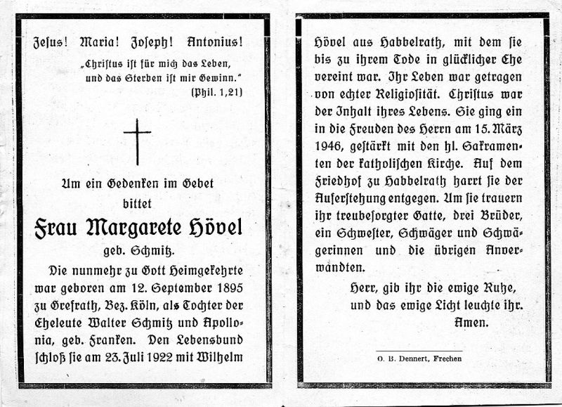 Eltern: Walter Schmitz u. Apollonia geb. Franken; ∞ 23.7.1922 Wilhelm Hövel aus Habbelrath; Friedhof zu Habbelrath |