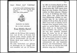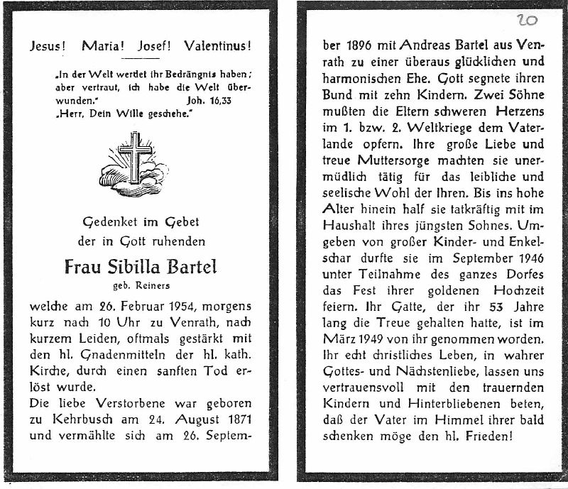 | ∞ 26.9.1896 Andreas Bartel aus Venrath, † März 1949; 10 K.; 1 Sohn im 1. Weltkrieg, 1 Sohn im 2. Weltkrieg gefallen; half bis zuletzt im Haushalt des jüngsten Sohnes 1946 Goldhochzeit; |