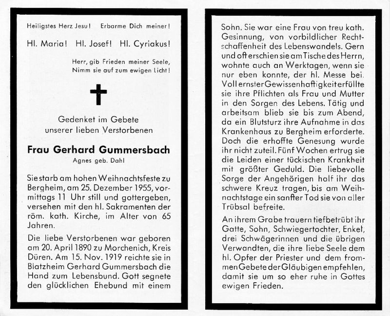 ∞ 15.11.1919 in Blatzheim Gerhard Gummersbach; 1 Sohn: Tod nach 5 Wochen nach einem Blutsturz |