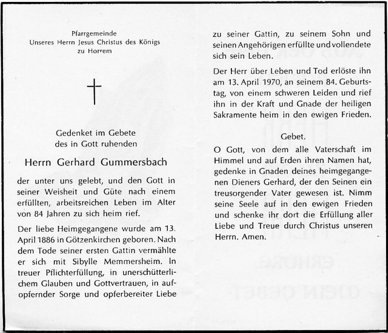Pfarrgemeinde Christkönig zu Horrem; 1 Gatinn †; † Sibylle Memmersheim; 1 Sohn; schweres Leiden |