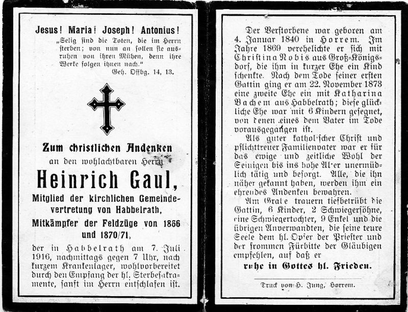 Mitgl.d. Kirchl. Gemeindevertretung Habbelrath; Mitkämpfer der Feldzüge von 1866 u. 1870/71; ∞ 1869 Christina Nobis aus Großkönigsdorf, früh †; 1 K.; ∞ 22.11.1873 Katharina Bachem aus Habbelrath; 6 K (1† ) |