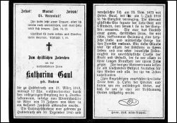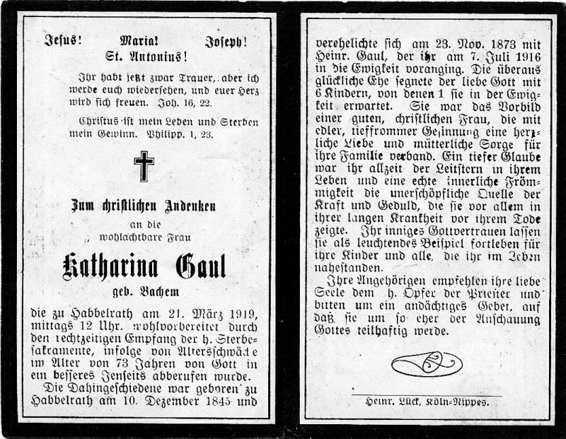 ∞ 23.11.1873 Heinrich Gaul, † 7.7.1916; 6 K., davon 1 †; lange Krankheit |