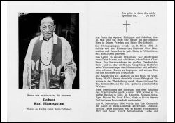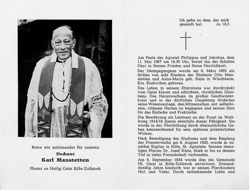 Eltern:Otto Manstetten u. Anna-Maria geb. Stein; Leutnant im 1. Weltkrieg; Priesterweihe 8.8.1920; Kaplan in Köln, St. Aposteln; 6.9.1934 Pfarrer an Heilig Geist in Köln-Zollstock; seit 1948 Dechant |