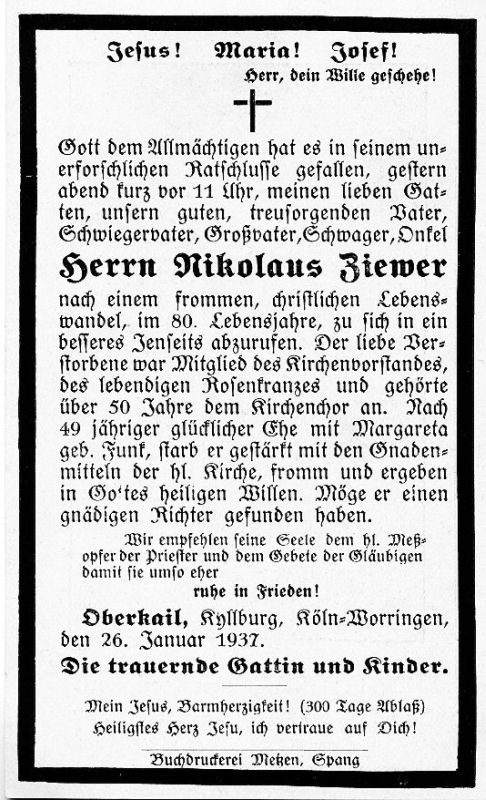 80 J.; Migl. d. Kirchenvorstandes; 50 J. Mitgl. d. Kirchenchores; hinterläßt Gattin u. Kinder (Orte: Oberlail, Kyllburg, Köln-Worringen) |