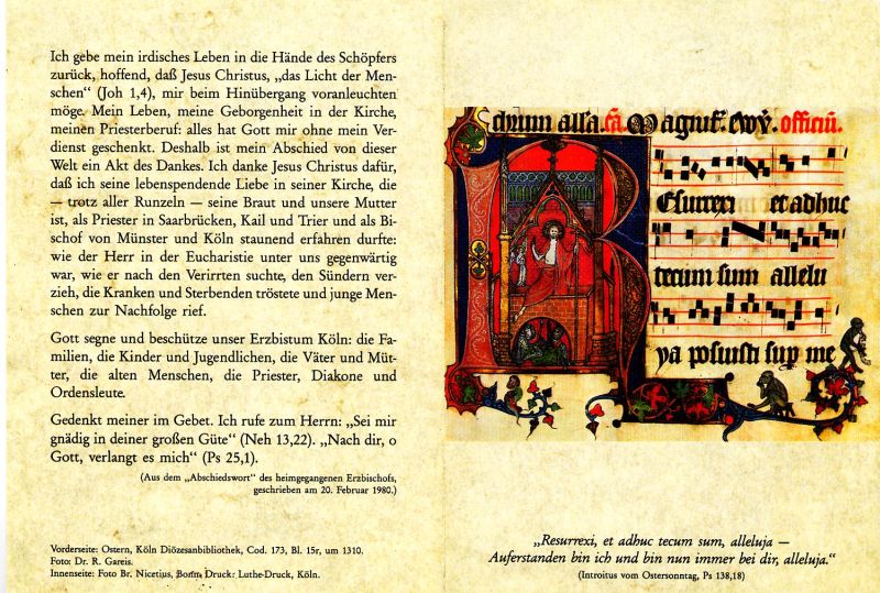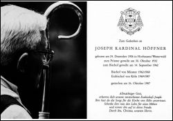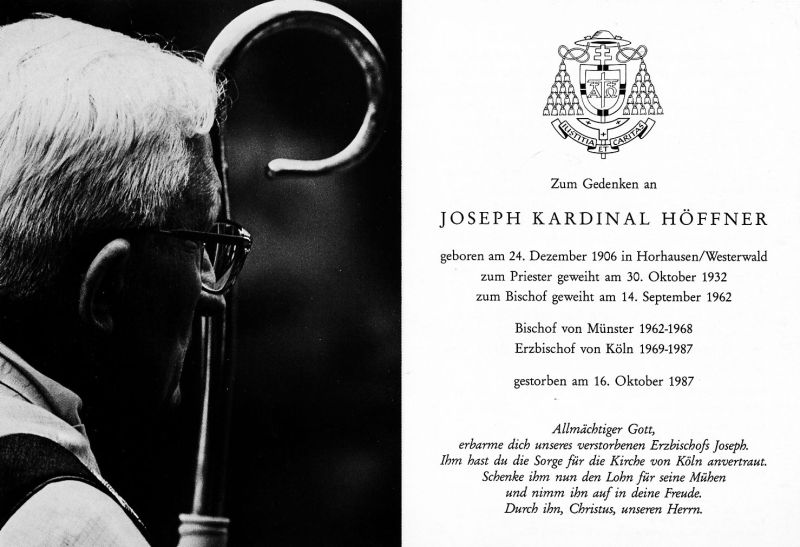 Priesterweihe 30.10.1932; zum Bisch geweiht 14.9.1962; Bischof v. Münster 1962-1968; Erzbischof v. Köln 1969-1987; Kardinal |