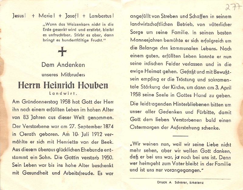 | ∞ 10.7.1912 Henriette van der Beek, † 1950; 1 Sohn; Landwirt; |