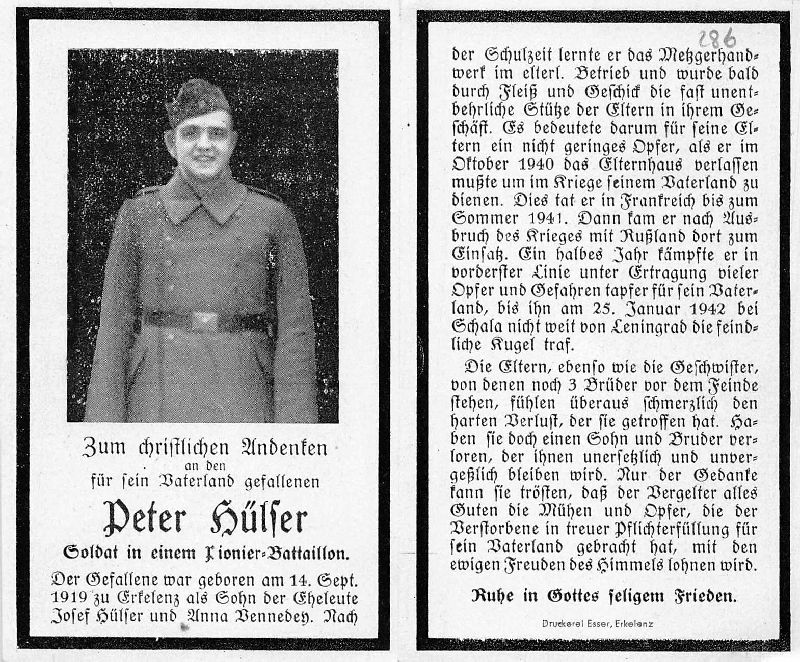 | Gefallener 2. Weltkrieg; Eltern: Josef Hülser u. Anna geb. Vennedey; Metzgerhandwerk; im elterl. Betrieb; Okt. 1940 Einberufung; bis Sommer 1941 in Frankreich; dann Russland; 3 Brüder im Feld |