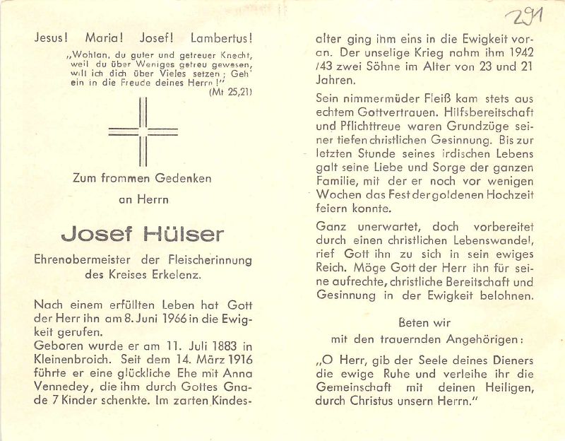 | Ehrenobermeister der Fleischerinnung des Kreises Erkelenz; ∞ 14.3.1916 Anna Vennedey; 7 K., davon 1 früh †, 2 Söhne 1942/43 im 2. Weltkrieg gefallen; |