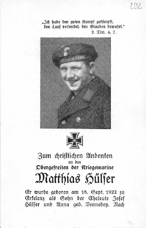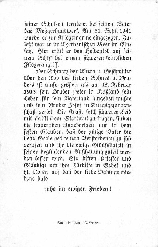 | Gefallener 2. Weltkrieg; Metzgerhandwerk; Bruder Peter am 15.2.1942 in Russland gefallen; Bruder Josef in Kriegsgefangenschaft |