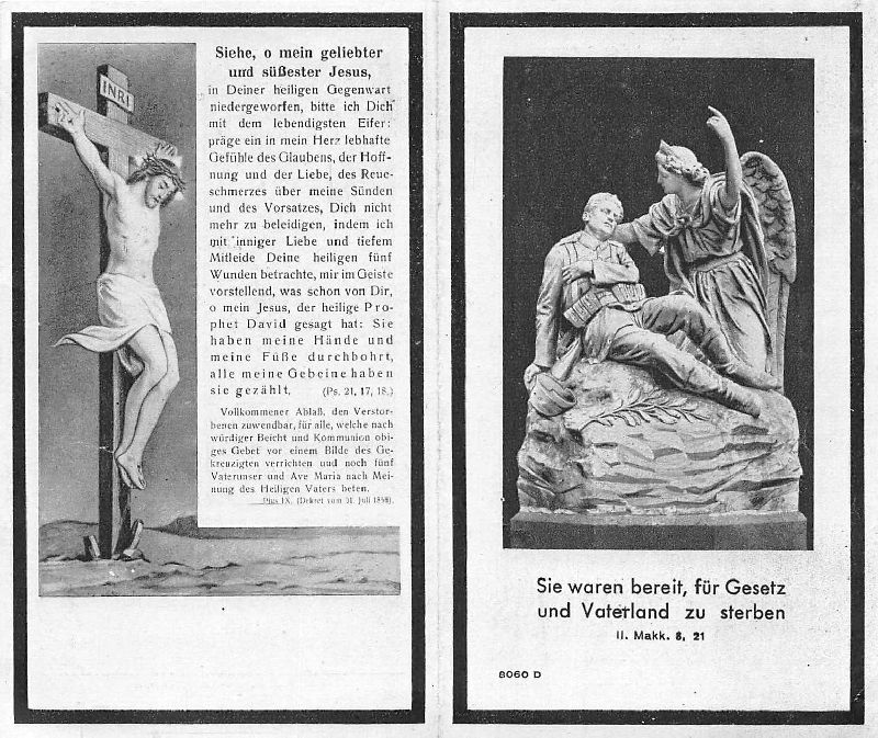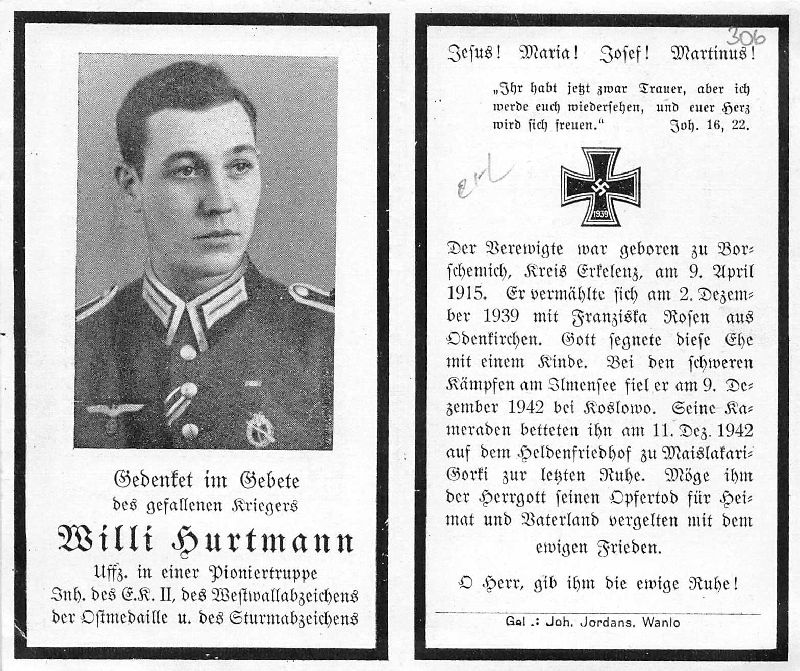 Gefallener 2. Weltkrieg; ∞ 2.12.1939 Franziska Rosen aus Odenkirchen; 1 K.; Heldenfriedhof Maislakari-Gorki; Druck in Wanlo |