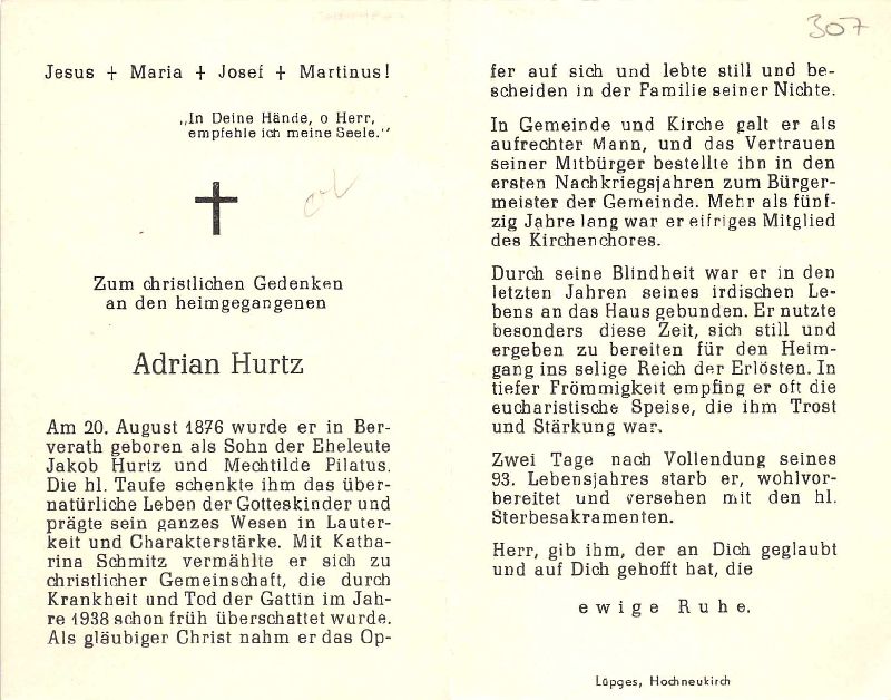 Eltern: Jakob Hurtz u. Mechtilde geb. Pilatus; ∞ Katharina Schmitz, † 1938; in den ersten Nachkriegsjahren Bürgermeister der Gemeinde; mehr als 50 J. Mitgl. Kirchenchor; in den letzten Jahren erblindet; Druck in Hochneukirch |