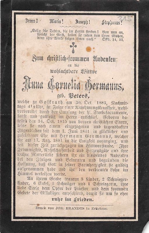 | ∞ 1.6.1841 Hermann Germanns, † 17.8.1881; 3 überlebende Kinder; Druck in Erkelenz |