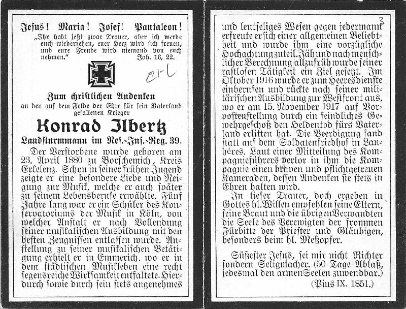 | Gefallener 1. Weltkrieg; Schüler des Konservatoriums der Musik in Köln; Anstellung als Musiker in Emmerich; Okt. 1916 Einberufung; Soldatenfriedhof Lanhéres |