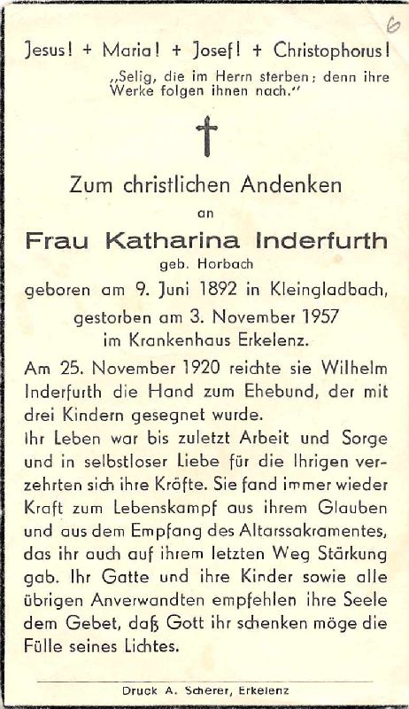 | ∞ 25.11.1920 Wilhelm Inderfurth; 3 K.; Druck in Erkelenz |