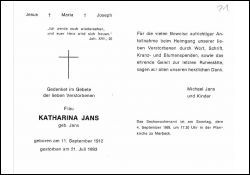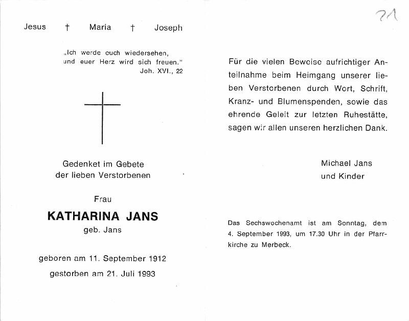 | Totenzettel-Nr.: | 41017 |  | Name: | Jans, geb. Jans |  | Vorname: | Katharina |  | Geburtsdatum: | 11.09.1912 |  | Sterbedatum: | 21.07.1993 |  | Bearbeiter: | H.-G. Porten (Bild) / J. Wißkirchen (Text) |  | Sammlung: | Stadtarchiv Erkelenz |  | Sonstiges: |  | ∞ Michael Jans; Kinder; Pfarrgemeinde Merbeck |  |