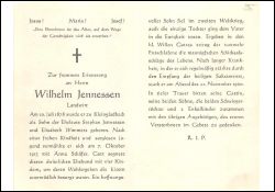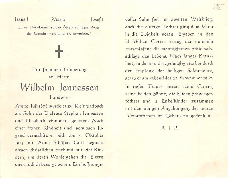 Landwirt; lange Krankheit; Eltern: Stephan Jennessen u. Elisabeth geb. Wimmers; ∞ 7.10.1913 Anna Schäfer; 4 K.; 1 Sohn im 2. Weltkrieg gefallen, 1 Tochter †; |