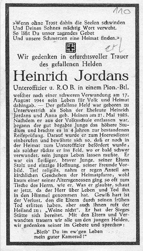 Gefallener 2. Weltkrieg; Eltern: Heinrich Jordans u. Anna geb. Heinen; Abitur; danach zur Wehrmacht |