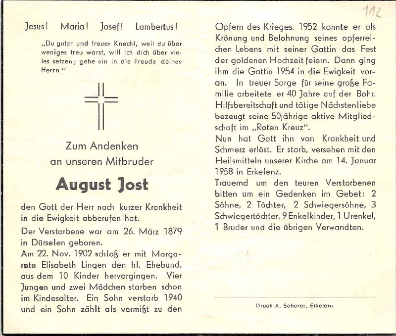 ∞ 22.11.1902 Margarete Elisabeth Lingen, † 1954; 10 K., davon 6 im Kindesalter †; 1 Sohn † 1940, 1 Sohn im 2. Weltkrieg vermisst; arbeitete 40 J. auf der Bahn; 50 J. Mitgl. Rotes Kreuz |