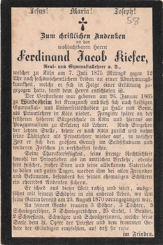 | Real- u. Gymnasiallehrer a.D.; Abnehmungskrankheit; zuerst Privatlehrer in Köln, später an der höheren Bürherschule in Köln, danach am Progymnasium Erkelenz; nach dem Eingehen dieser Stelle zurück nach Köln; wieder als Privatlehrer tätig; seie Frau † 23.8.1870; 6 überlebende Kinder |