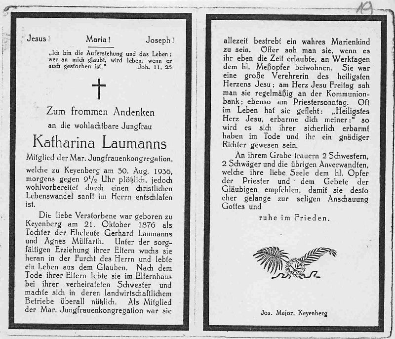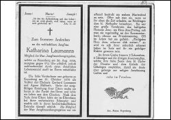 | Jungfrau; Mitgl. Jungfrauenkongregation; Eltern: Gerhard Laumanns u. Agnes geb. Mülfahrt; lebte bei Schwester u. arbeitete mit in deren landwirtsch. Betrieb |
