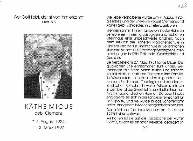 | Eltern: Robert Clemens u. Agnes geb. Schroeder; seit 1943 Studium in Köln: Erkunde, Geschichte, Deutsch; ∞ 27.3.1951 Ignaz Micus; 5 K.; Studium der Theologie u. nierländ. Sprache; engagierte sich in Landeselternschaft für Schulpolitik; Schöffin beim Langericht Mönchengladbach |