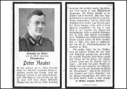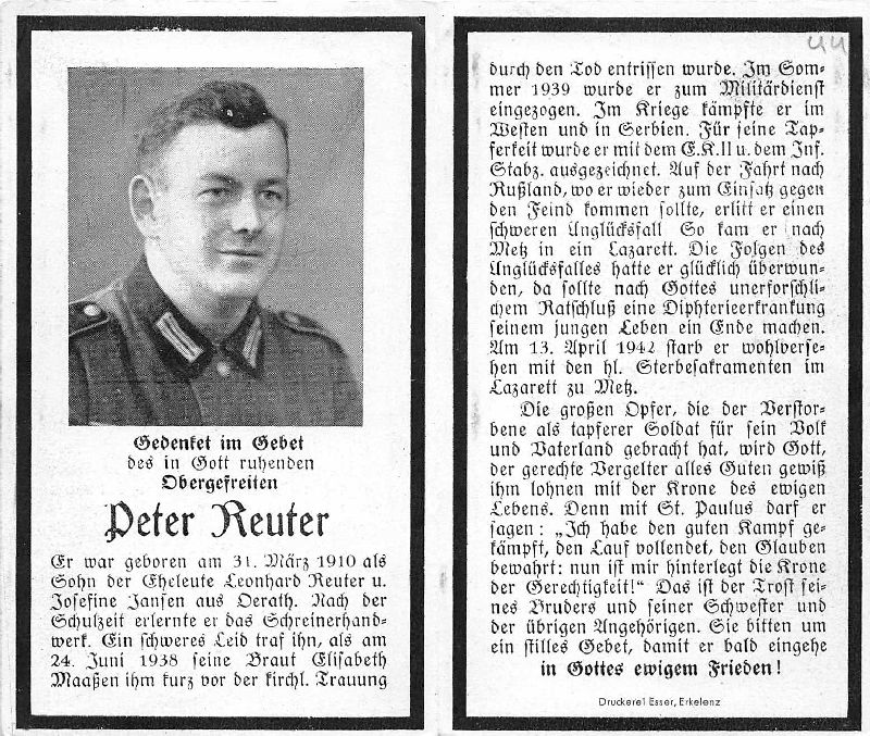 Gefallener 2. Weltkrieg; Eltern: Leonhard Reuter u. Josefine geb. Jansen; Schreinerhandwerk; 24.6..1938 starb seine Braut Elisabeth Maaßen kurz vor der kirchl. Trauung; Sommer 1939 Einberufung; kämpfte im Westen, Serbien, Russland; erlitt schweren Unglücksfall; kam nach Metz in ein Lazarett; Diphtherieerkrankung; Druck in Erkelenz |
