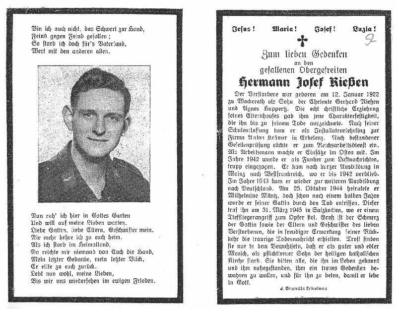 Gefallener 2. Weltkrieg; Eltern: Gerhard Rießen u. Agnes geb. Huppertz; Installateurlehrling; RAD; 1942 als Funker nach Westfrankreich; ∞ 25.10.1944 Wilhelmine Mäntz; Tod bei Tieffliegerangriff; vgl. Nr. 41882 |