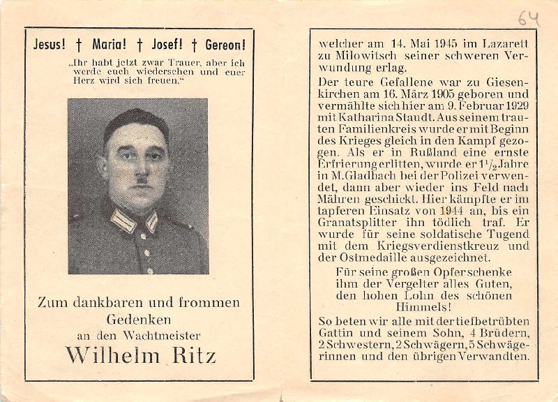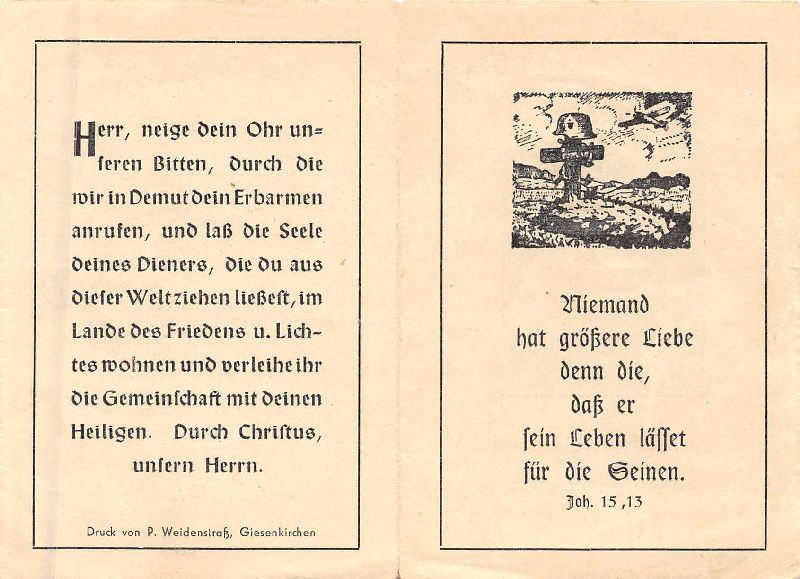 | Gefallener 2. Weltkrieg; ∞ 9.2.1929 Katharina Staudt; seit Kriegsbeginn 1939 Soldat; erlitt in Russland ernste Erfrierungen, deshalb 1 1/2 Jahre Verwendung bei der Polizei in Mönchengladbach, dann aber 1944 wieder an die Front nach Mähren geschickt; |