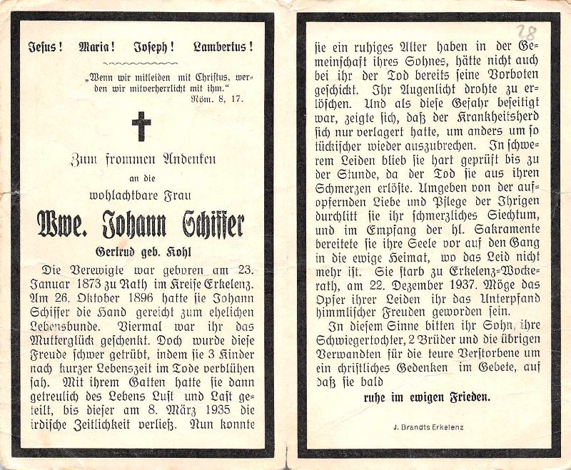 ∞ 26.10.1896 Johann Schiffer, † 8.3.1935; 4 K., davon 3 früh †; schmerzliches Siechtum |