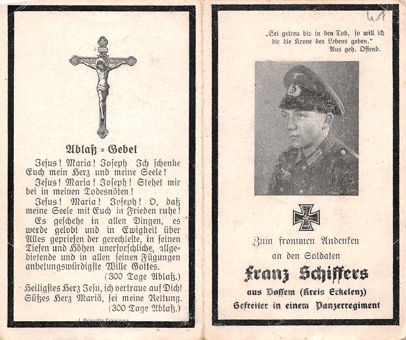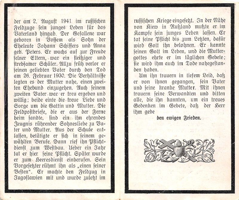 Gefallener 2. Weltkrieg; Eltern: Johann Schiffers, † 26.2.1930, u. Anna geb. Peters (Wiederverheiratung); über 1 J. dienstverpflichtet am Westbau; Soldat in Jugoslawien, zuletzt im Osten |