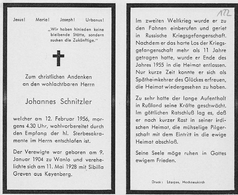 ∞ 11.5.1928 Sibilla Greven aus Keyenberg; Soldat im 2. Weltkrieg, russ. Kriegsgefangenschaft; erst 1955 in die Heimat entlassen (Spätheimkehrer); gesundheitlich geschwächt; Druck in Hochneukirch |