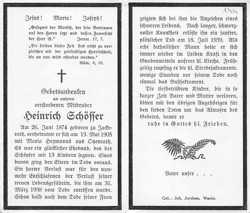 ∞ 13.5.1905 Maria Heymanns aus Otzenrath, † 31.3.1938; 13 K., davon 1 †; schweres Leiden |