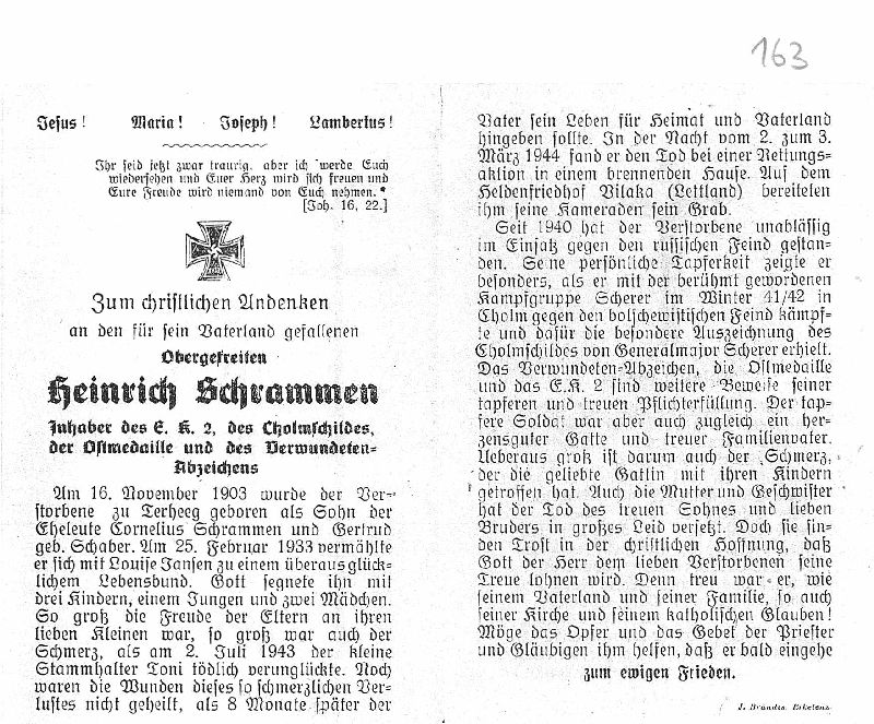 | Gefallener 2. Weltkrieg; Eltern: Cornelius Schrammen u. Gertrud geb. Schaber; ∞ 25.2.1933 Louise Jansen; 3 K., davon Söhnchen Tni am 2.7.1943 tödlich verunglückt; kämpfte Winter 1941/42 mit Kampfgruppe Scherer in Cholm; Heldenfriedhof Vilaka, Lettland |