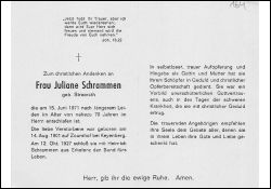 | Totenzettel-Nr.: | 42169 |  | Name: | Schrammen, geb. Streerath |  | Vorname: | Juliane |  | Geburtsort: | Keyenberg, Zourshof |  | Geburtsdatum: | 14.08.1901 |  | Sterbedatum: | 15.06.1971 |  | Bearbeiter: | H.-G. Porten (Bild) / J. Wißkirchen (Text) |  | Sammlung: | Stadtarchiv Erkelenz |  | Sonstiges: |  | Längeres Leiden; ∞ 12.10.1927 Heinrich Schrammen aus Erkelenz |  |