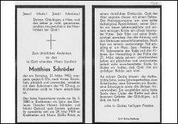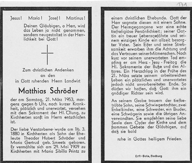 | Totenzettel-Nr.: | 42175 |  | Name: | Schröder |  | Vorname: | Matthias |  | Geburtsort: | Kirchherten |  | Geburtsdatum: | 16.03.1880 |  | Sterbeort: | Kirchherten |  | Sterbedatum: | 21.03.1953 |  | Bearbeiter: | H.-G. Porten (Bild) / J. Wißkirchen (Text) |  | Sammlung: | Stadtarchiv Erkelenz |  | Sonstiges: |  | Eltern: Theodor Hubert Schröder u. Maria Gertrud geb. Smeets; ∞ 29.5.1909 zu Kirchherten Maria Sibilla Printz; 1 Sohn; |  |