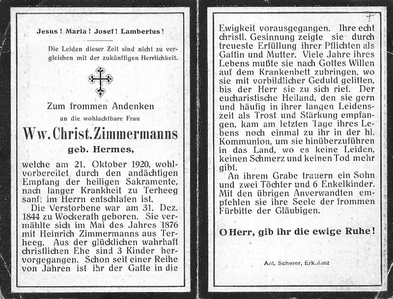 ∞ Mai 1876 Heinrich Zimmermanns aus Terheeg, schon seit Jahren †; 3 K.; mehrere Jahre bettlägrig; |