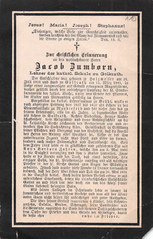 Lehrer der kath. Schule zu Golkrath; langwieriges Magenleiden; Lehrerseminar Brühl; 1837-40 Lehrer in Manderfeld, seit 1840 in Golkrath; ∞ 1842 Anna Barbara Zahren, † 2.5.1866; 5 K.; 1 Sohn Priester, aber bereits am 26.5.1881 †; |