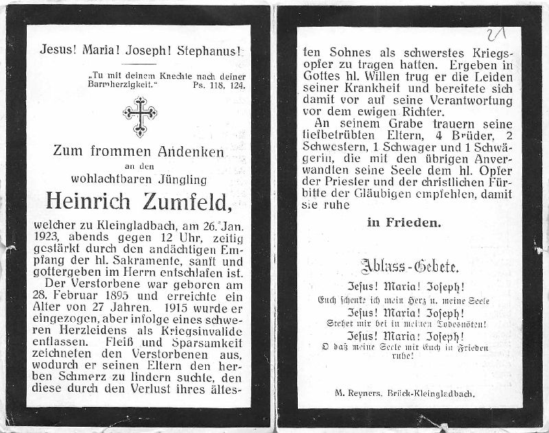 Jüngling; 1915 zum Militär einberufen; wegen schweren Herzleidens als Kriegsinvalide entlassen; Opfer 1. Weltkrieg; Druck in Brück-Kleingladbach |