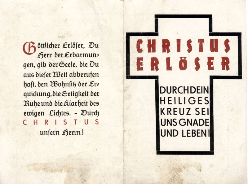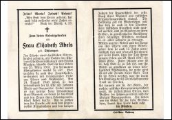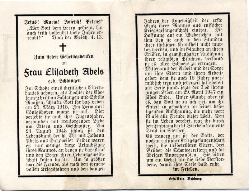 Eltern: Christian Schlangen u. Sibilla geb. Maaßen; ∞ 24.8.1943 Johann Abels aus Garzweiler; Ehemann in russischer Kriegsgefangenschaft; Druck in Bedburg/Erft |
