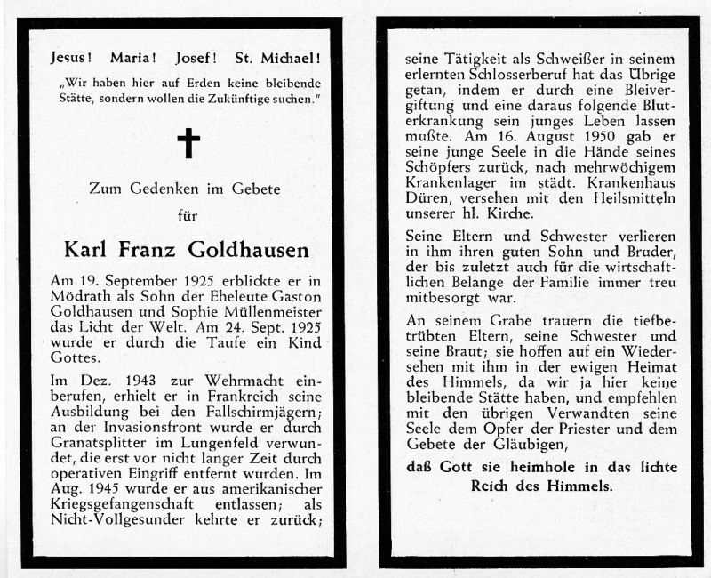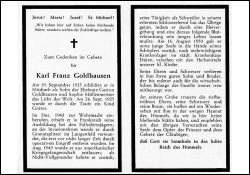 Eltern: Gaston Goldhausen u. Sophie geb. Müllenmeister; im 2. Weltkrieg Granatsplitterverletzung, erst vor kurzem operativ entfernt wurde; 1945 amerikan. Kriegsgefangenschaft; Schweißer, berufl. Bleivergiftung |