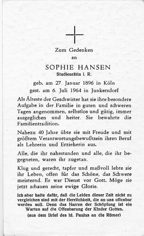 Studienrätin i.R.; 40 J. lang als Lehrerin tätig; als Älteste der Geschwister bewahrte sie die Familientradition |