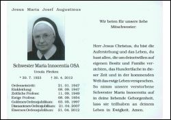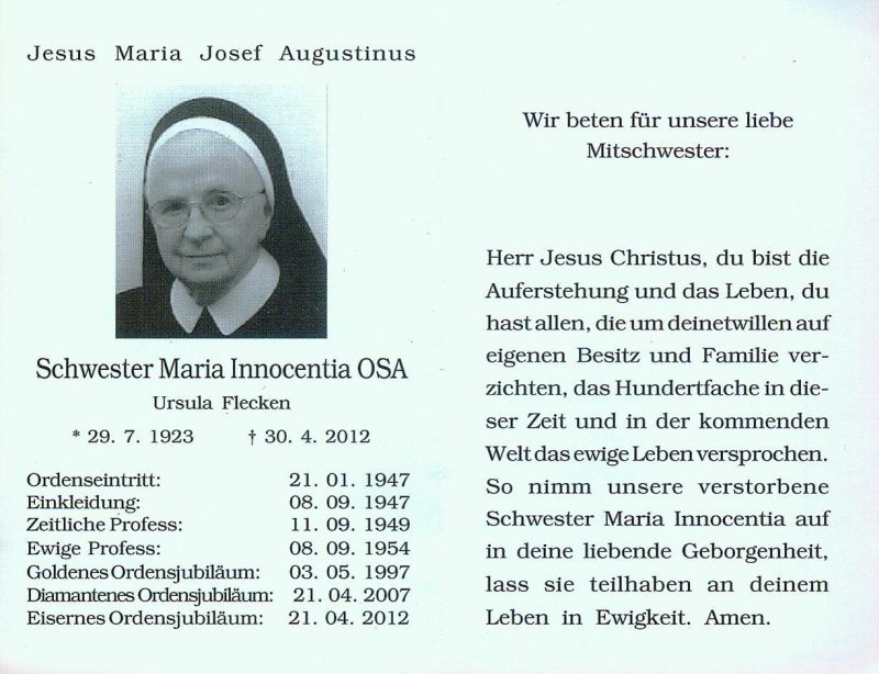 Maria Innocentia OSA, Sr., geb. Flecken | | Vorname: |